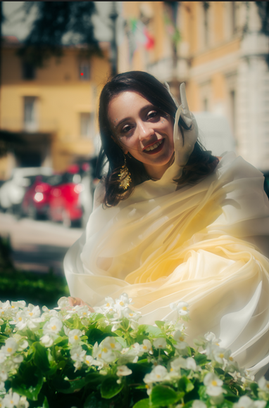 Il desiderio di legami veri. La speranza di un equilibrio che non crolla. Un abbraccio — etereo, sospeso — che avvolge e protegge. L’abito è una rosa: un fiore che accoglie, che respira, petali che si aprono come gesti di fiducia, un vortice lieve che unisce e avvolge. Tra assenze e ritorni, si cerca stabilità nel movimento, come una carezza che resta nell’aria. Ogni piega è un respiro, ogni filo un’emozione intrecciata. Così la collezione racconta l’incontro tra fragilità e forza —la necessità di appartenere, il bisogno di sentirsi accolti, l’eco di un noi che vive anche solo per un istante.